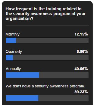 SC Magazine ran a poll this week, and asked: "How frequent is the training related to the security awareness program at your organization?" A whopping 40% answered "We don't have a security awareness program"