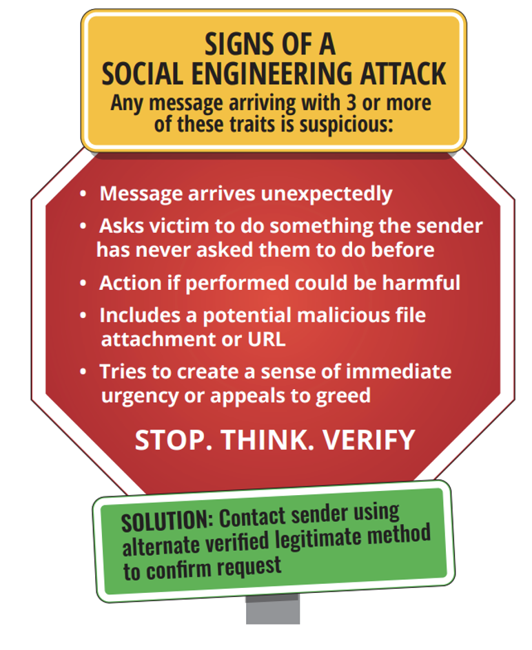 Here are the five signs anyone can look for to determine if a message is possibly a social engineering scam, no matter what the medium: