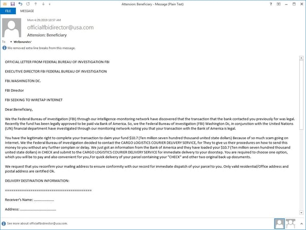 1. Do we really think FBI Directory Wray is going to be emailing us personally in order to arrange a transfer of $10.7 million dollars?