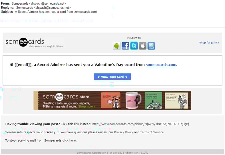 Do not trust an online greeting card, particularly if it does not indicate who sent it to you. Be very wary of a card sent by "a secret admirer." Even if you recognize the name, confirm that it was really sent from that person before you click on the link and open the card.