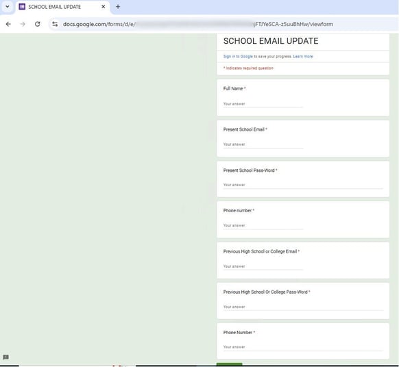 Both examples below show the second stage of this education-based phishing attack, triggered after the recipient scans the QR code or clicks a malicious link in the email. By using a legitimate service like Google Forms, the attacker leverages the widespread trust individuals have in this platform, lowering their suspicion and making it more likely that they will input their data.