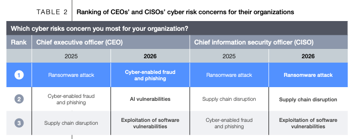 Cyber-enabled fraud and phishing have overtaken ransomware as CEOs’ top cybersecurity concern in 2026. According to the report, 73% of respondents said they, or someone close to them, were personally affected by cyber-enabled fraud last year.