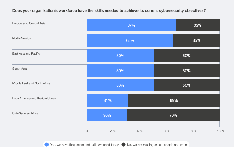 Skills shortages remain a critical constraint. Around 70% of CEOs in sub-Saharan Africa and 69% in Latin America & the Caribbean say they lack the people and skills needed to meet current cybersecurity objectives.
