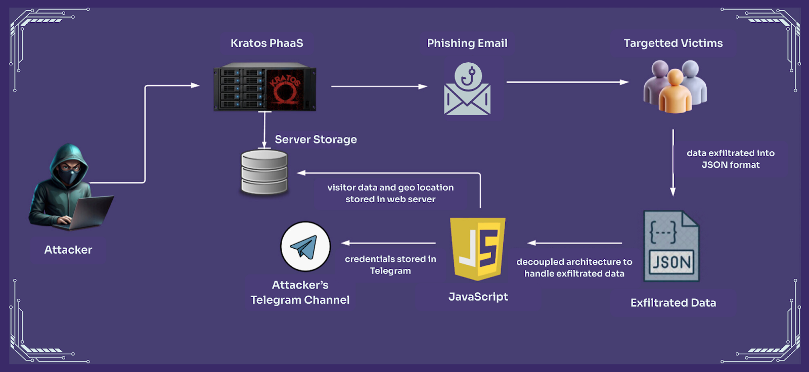 The Kratos platform operates on a circular, highly resilient logic designed to maximize data harvesting while minimizing the attacker's footprint. The kit's backend captures critical visitor data and geolocation, stored in web server storage to filter out security researchers and non-target regions. Upon successful credential entry, the kit uses a JavaScript-based decoupled architecture to process exfiltrated data.