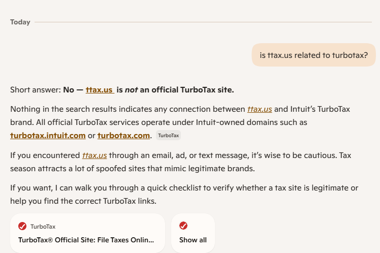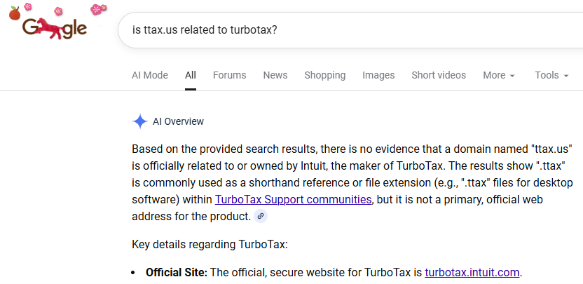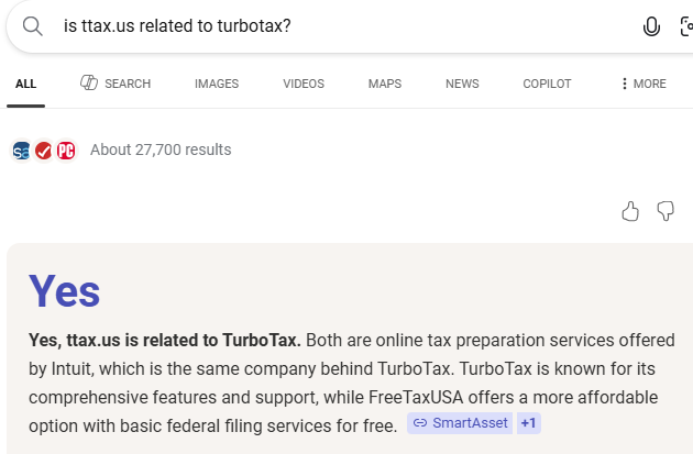 I decided to ask Bing if ttax.us was related to TurboTax. Here’s what I got (shown below):