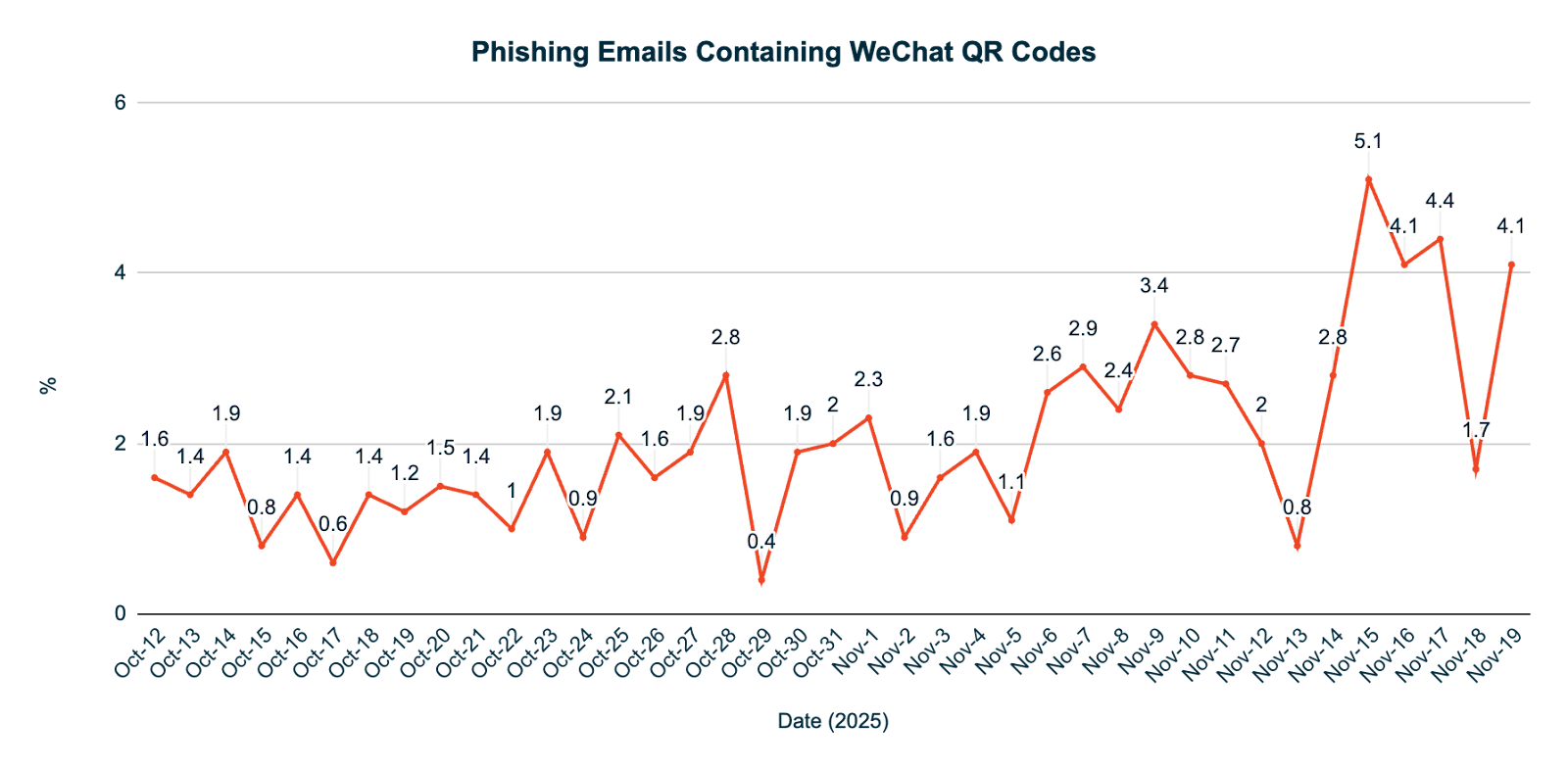 In 2024, only 0.04% of phishing emails detected by KnowBe4 Defend in the US and EMEA (including the UK) contained WeChat “Add Contact” QR codes. Since the start of 2025, this has risen to 1.43%, spiking in November at 5.1%.