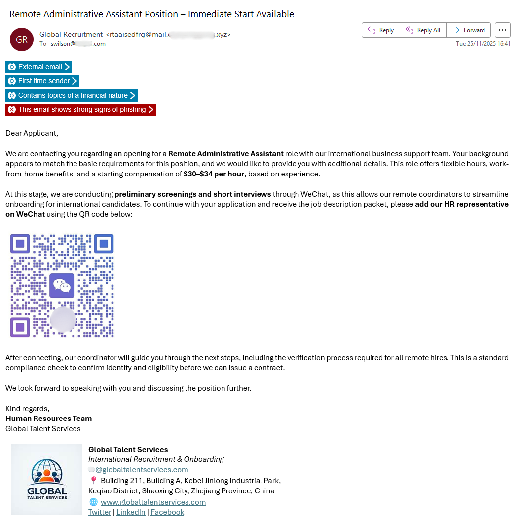 Matches “WeChat lead funnel” kits used in job, romance, and investment fraud |
